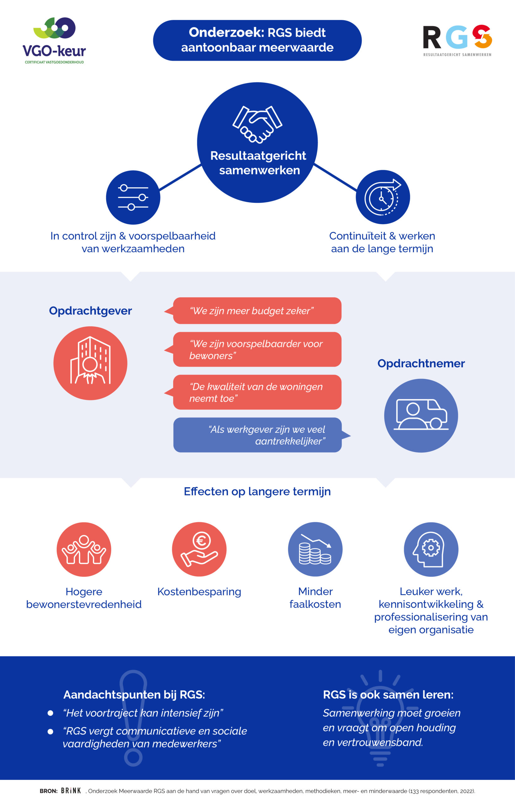In 2022 heeft Brink in opdracht van Stichting RGS en Stichting VGO een onafhankelijk onderzoek uitgevoerd naar de meerwaarde van resultaatgericht samenwerken (RGS). Het beeld dat uit dit onderzoek naar voren komt is positief. Op een flink aantal aspecten ervaren zowel opdrachtgevers als opdrachtnemers duidelijk meerwaarde van het werken met RGS. Deze hebben te maken met voorspelbaarheid, in-control zijn, continuïteit en werken aan de lange termijn. Opdrachtgevers ervaren meer budgetzekerheid en verbetering van de kwaliteit van woningen. Opdrachtnemers ervaren dat zij aantrekkelijker werkgevers zijn geworden. Effecten op langere termijn zijn hogere bewonerstevredenheid, kostenbesparing en faalkostenreductie. RGS zorgt voor leuker werk, kennisontwikkeling en professionalisering.
